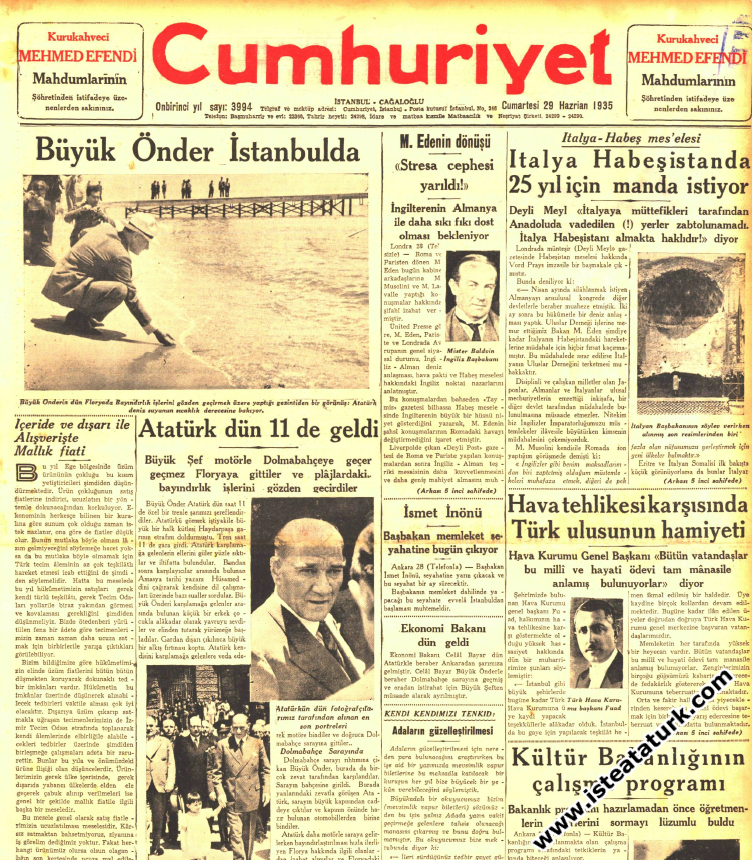Kaynak: Cumhuriyet Gazetesi, 29 Haziran 1935, 1. ve 3. sayfalar