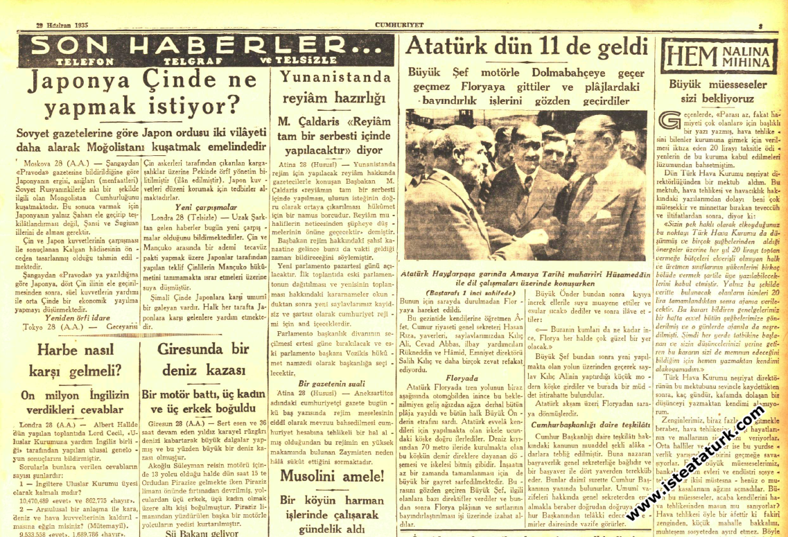 Mustafa Kemal Atatürk İstanbul seyehati için Ankara'dan yola çıkmış ve sabah 11:00 de  Haydarpaşa Garı'na gelmişlerdir. Bugün Florya Plajı'nda yaşananları, 29 Haziran 1935 tarihli Cumhuriyet Gazetesinden aynen aktaralım;