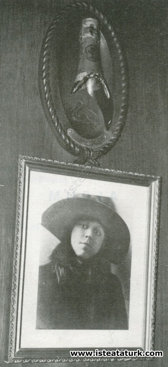 Savarona yatının ilk sahibi Bayan Cadwalader fotoğrafı ve onun üstünde çerçeve içinde yatın denize indirilmesi sırasında patlatılan şampanya şişesi kırığı.